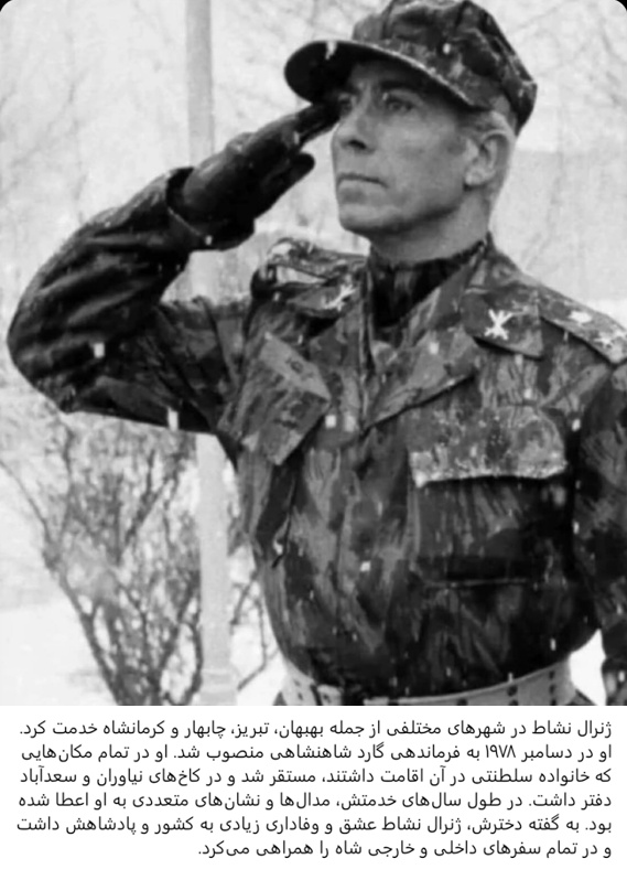 General Neshat served in various cities including Behbahan, Tabriz, Chabahar, and Kermanshah. He was appointed Commander of the Imperial Guard in December 1978. He was deployed and positioned in all the locations where the Royal Family had residences, and had an office in both the Niavaran and Sa’adabad Palaces. During his years of service, he had been awarded numerous medals and decorations. According to his daughter, General Neshat had great love and loyalty for his country and his king, and accompanied the Shah in all his domestic and international trips. (Shirin Neshat’s memoirs).