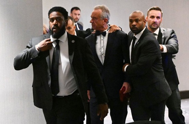 Others yelled to duck. From one corner, a “God Bless America” chant began as Trump was escorted off stage. He fell briefly — he apparently tripped — and was helped up by Secret Service agents. A law enforcement official confirmed there was a shooter but no further details were immediately available. All officials protected by the Secret Service were evacuated. Organizers were attempting to resume the dinner.