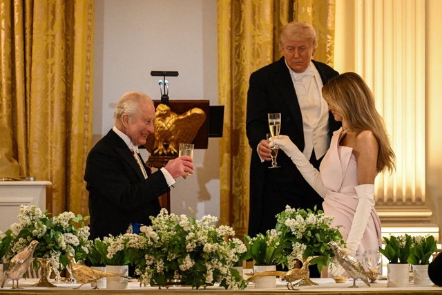 Britain’s King Charles III shares a toast with US President Donald Trump and First Lady Melania Trump during a State Dinner in the East Room of the White House in Washington, DC, on April 28, 2026. Charles referenced the impact the UK has had on the American landscape, sharing that his “family’s history remains reflected in your maps, which read rather like our Christmas card list across the ages – North and South Carolina, Virginia, Maryland, and the cities of Charleston (a particular favourite of mine, obviously), Georgetown (and, for that matter, Georgia), Annapolis, and (further favourites) Prince William County and Williamsburg.”