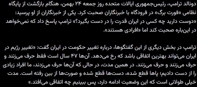دونالد ترامپ، رئیسجمهوری ایالات متحده روز جمعه ۲۴ بهمن، هنگام بازگشت از پایگاه نظامی «فورت برگ» در فرودگاه با خبرنگاران صحبت کرد. یکی از خبرنگاران از او پرسید: «دوست دارید چه کسی در ایران قدرت را در دست بگیرد؟» ترامپ پاسخ داد که نمیخواهد در اینباره صحبت کند اما «افرادی هستند».… pic.twitter.com/j5UH4z1yjJ